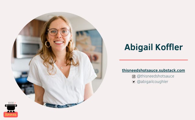 Abigail is a Brooklyn based writer and the founder of This Needs Hot Sauce (TNHS) — a food newsletter that she started in 2017 while getting over an unsatisfying job and break up (tubs of ice cream isn’t the only way). Subscribe here and you won’t be disappointed. TNHS talks about recipes, restaurant recommendations and articles to read. Everything is vegetarian and approachable.